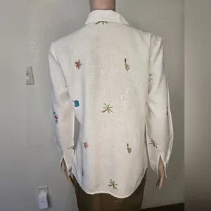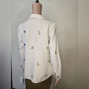 This is a women's white blouse by Richard Malcolm in size S. Made from 100% Irish linen, the blouse features a collared neckline, button closure, and 3/4 sleeves. The shirt is designed with a waist length and button accents for added detail. It is a versatile piece suitable for casual occasions and can be worn in all seasons due to its knit linen fabric, making it a stylish and comfortable choice for everyday wear.