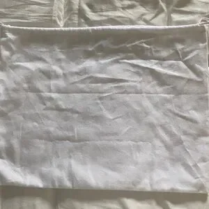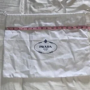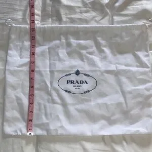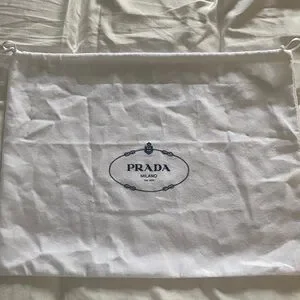 Elegant Prada dust bag in white. Features blue logo detailing.
