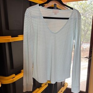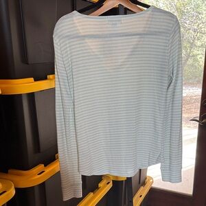 Cozy and lightweight GAP Love Collection pajama set in a soft mint + white micro-stripe. The fabric is a comfy ribbed knit with great stretch—perfect for lounging, sleep, or relaxed everyday wear. Top features a flattering scoop neckline and relaxed fit. Matching bottoms have an elastic waist and slim leg silhouette.
