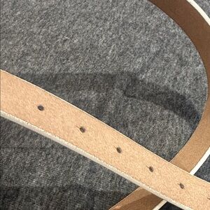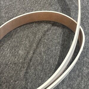 Elegant white faux leather belt featuring a striking gold buckle. Perfect for adding a touch of sophistication to any outfit.