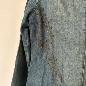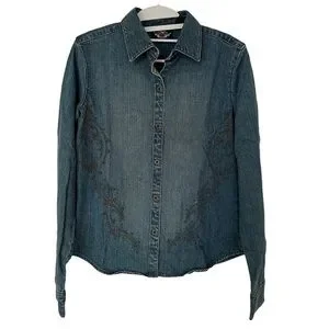 HARLEY DAVIDSON Studded & Embroidered Logo Denim Button Up Shirt in Blue Size M