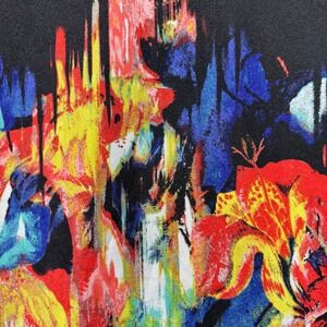 This women's top by John Paul Richard showcases a vibrant abstract floral print. The design features a black base with bold splashes of red, yellow, blue, green, and white, creating a striking, artistic effect. The back of the top is solid black, offering a balanced contrast to the colorful front. The neckline is a flattering scoop neck, and the sleeves are cap style. This piece is perfect for adding a pop of color and artistry to your casual wardrobe or for a creative office environment.