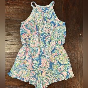 This vibrant floral kids romper is perfect for playful days. Featuring a mix of blue, pink, and green, it offers both style and comfort. Pockets. Snap at the back of the neck. Elastic waist.