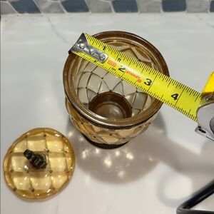 Elegant amber jar with a decorative bronze base. Perfect for adding a vintage touch to any space. About 3 and a half inches wide and 5 inches tall.