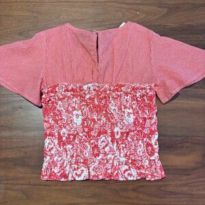 by Anthropologie Short Sleeve Smocked Linen Cropped Top in red raspberry pattern. Chic blouse with smocked floral design, features striped flutter sleeves. Back keyhole button closure. Fitted smocked bodice. Ideal for stylish outings. Brand new with tags. Size S