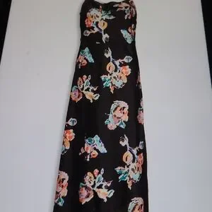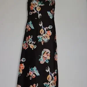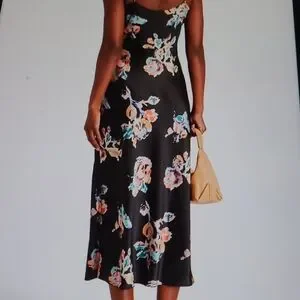 Chic black midi dress with colorful floral design. Ideal for versatile styling.