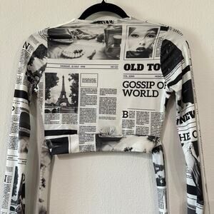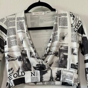 Featuring a newspaper print with a tie front design, this stunning crop top pairs great with jeans or black pants!