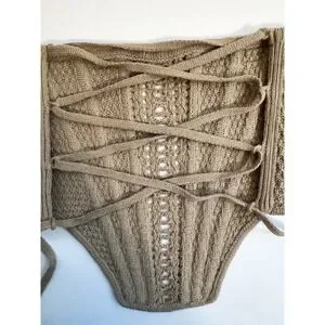 This strapless top is crafted from a premium crochet knit and features a lace-up back design with eyelet details on the front. It is designed with internal boning in the bodice to provide a "cinched" or "snatched" fit and has a distinctive square-shaped hem