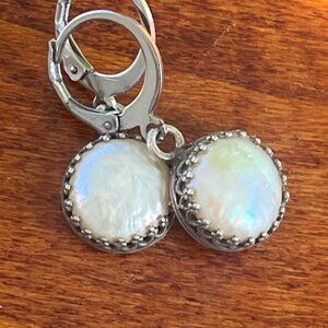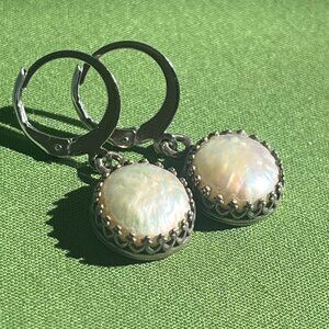 Elegant and timeless, these handcrafted earrings feature lustrous white freshwater coin pearls set in antiqued silver tone open back crown filigree bezel settings. The pearls shimmer with natural iridescence, making each pair one-of-a-kind. Suspended from secure silver-plated lever back ear wires, these earrings combine vintage-inspired charm with classic sophistication.