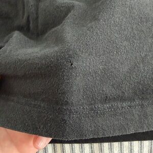 Men’s large black 100% cotton t shirt. Has one small hole at front bottom center of shirt approx 2” above hem, otherwise in great used conditions with plenty of life left. Flat measurements are pit to pit 23”, length 27”. From a pet & smoke free home.