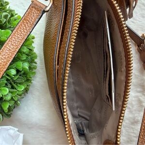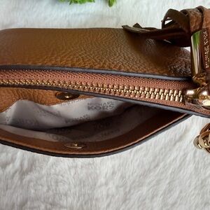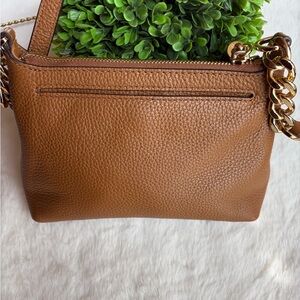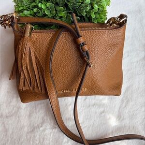 Michael Kors brown pebble leather crossbody bag with convenient adjustable strap for easy carrying.