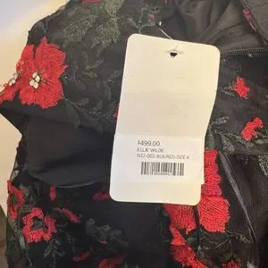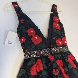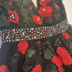 Size 4 Ellie Wilde black ball gown with red floral embroidered and a sparkling crystal belt. Sleeveless with v neck. Full skirt with lots of layers of tulle.