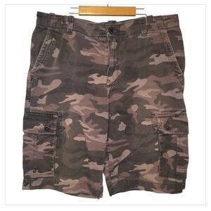 Men’s Midtown camouflage cargo shorts in size 34 – classic army green/brown camo print with functional cargo pockets for that rugged utility look.