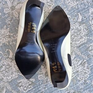 These have a pointed toe and made from a Italian calf leather with black elastic inserts on the side. A clean line silhouette with a approximately 2.75" heel. They are a pull-on style.