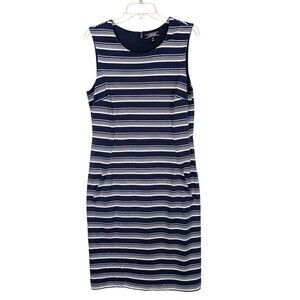 Lands' End Women's Dress Sleeveless Sheath Ponte Blue White Stripe Size 14 is in excellent pre-owned condition. Like new. Refer to the pictures and description for item specifics. Please note we do not know the history of each item and do our best to provide you with as many details as we can when necessary. Pockets, lined, zip closure, skirt vent.