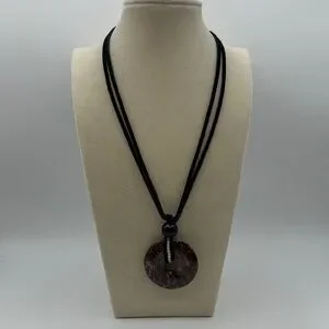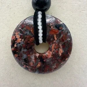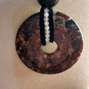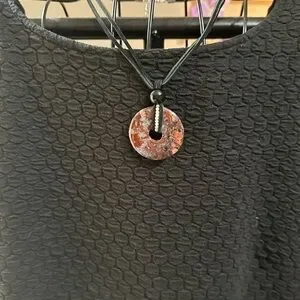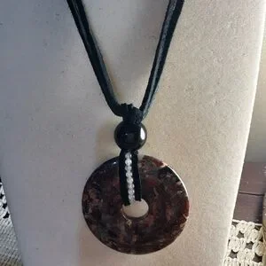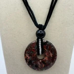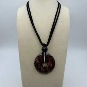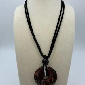 Mexican Crazy Lace Agate/“Laughter Stone” Donut Pendant on genuine leather in black color. The pendant is tied together with a 10mm black obsidian bead. Wrapped around the donut and intertwined with the leather are also 2mm white agate beads. Silver color hardware including a lobster clasp closure and approx 1.5” extender chain. Necklace rope is approx 15” long with about a 2.5” pendant drop. It can be worn to feature either side of the stone. It can be worn as a choker or as a longer setting if preferred. The pendant is dark red, dark pink/peach with splashes of black and white.