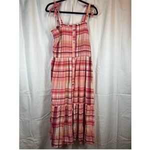True craft plaid smocked tiered shoulder tie maxi dress raw edges square neck