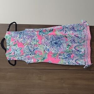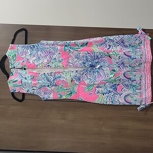 A painterly print—true to Lilly Pulitzer's iconic style—pops with color on this stretch-cotton sundress with princess seaming enhancing the flattering fit. 34" length Hidden back-zip closure Jewel neck Sleeveless Slit hem with bow accents 98% cotton, 2% spandex Machine wash, dry flat Imported Dresses