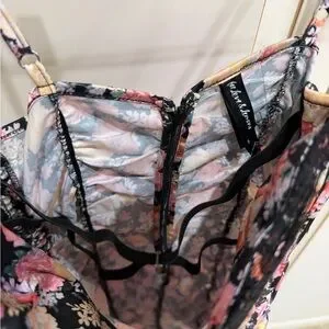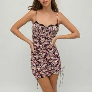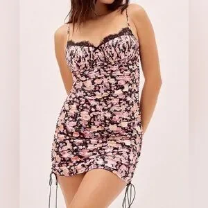 Zipper closure and adjustable straps. Also adjustable length with the side ties Soft silky satin combines with delicate scalloped lace on this ethereal mini dress. Complete with decorative buttons and functional drawstrings along the side