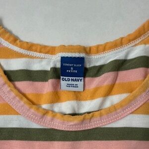 Colorful striped tank top and shorts set. Features orange, pink, and white stripes. The pajama top is a petite small and the pants are a size small.