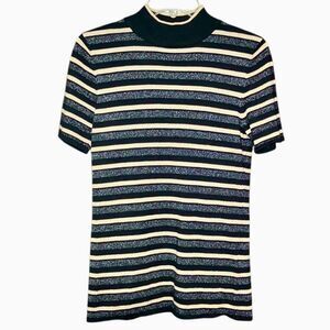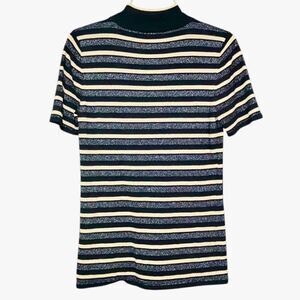 This short sleeve mock neck knit top has metallic gold and silver stripes on black. In excellent used condition.