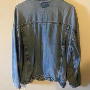 Classic light blue denim jacket. Features button-up front and chest pockets. Ideal for casual wear.