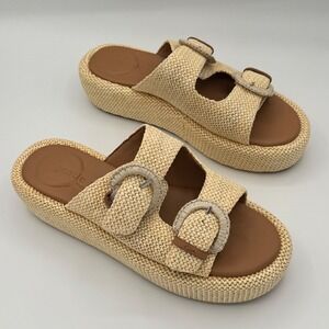 Stylish raffia platform sandals with cushioned leather footbed — comfortable and neutral for summer wear.