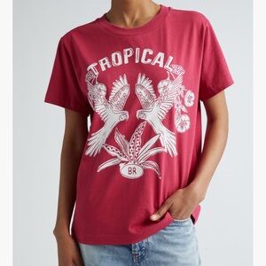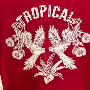Vibrant red tee with tropical parrot design. Fun and lively for women. Size medium.