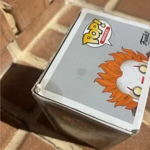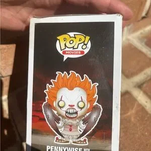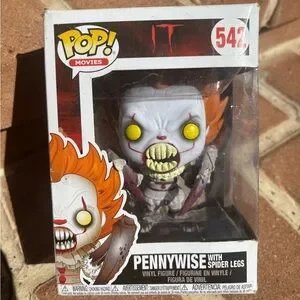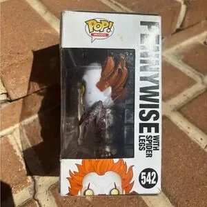 Funko Pop! Movies IT #542 “Pennywise with Spider Legs” vinyl figure—iconic horror collectible with bold yellow eyes and creepy spider-leg arms. Perfect for horrorcore, spooky season, gothic, dark academia, or Halloween display vibes. Preowned; figure looks good. Box has noticeable flaws (corner crushing, creases, edge wear, scuffs) but window is intact—priced accordingly. Color appears white/gray with red accents and orange hair in natural lighting.