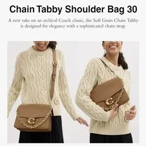 Chic and timeless, the Chain Tabby 30 is crafted in soft grain leather and finished with bold gold-tone signature “C” hardware and statement chain detailing. Designed for versatility, it includes three detachable straps for shoulder or crossbody wear. Exterior zip pocket and fabric-lined interior.