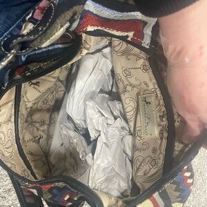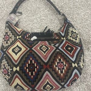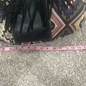 Stylish hobo bag with geometric patterns. Features fringe and turquoise accent. Perfect for a bold look.
