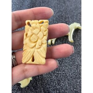 Vintage set of three vintage collectible items celluloid or early plastic jewelry lot includes three unique pieces: a detailed green sailing ship brooch, a cream-colored floral carved pendant, and a translucent yellow horse or dog figurine. The ship brooch features a classic pin back, while the floral piece is designed with holes for use as a pendant or slide. These novelty pieces showcase mid-century charm with intricate molded and carved details, perfect for collectors of vintage accessories or early plastics.