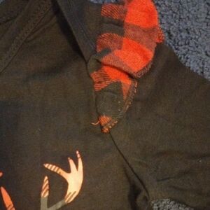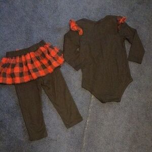 Adorable black and red Christmas outfit set. Includes a long-sleeve onesie with festive design and matching plaid skirt with leggings.
