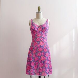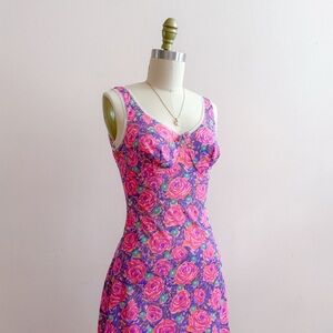 Vintage 70s Triumph International Amourette nylon slip dress, size 38. Fits like a modern day S (check out the measurements below). Features a vibrant, all-over rose print in shades of pink, purple, and teal, as well as a soft structured bust, dainty center bow, and a delicate white lace trim. Excellent vintage condition, no signs of wear.