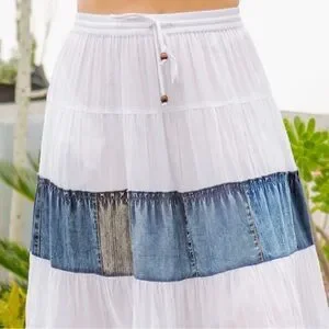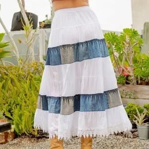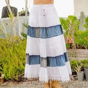 Beautiful white tiered skirt with blue denim patchwork panels and delicate lace trim at the hem. Flowy, feminine, and such a statement piece — perfect for spring, summer, or layering into fall.