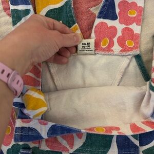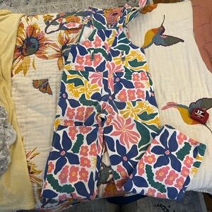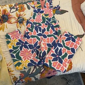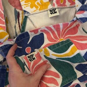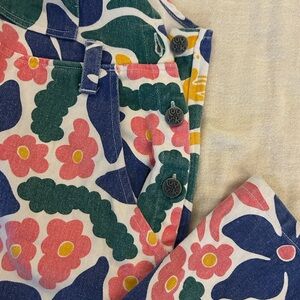 Vibrant floral overalls by Lucy & Yak. Features bold pink, blue, and yellow patterns. Perfect for a stylish look. 28” inseam wide leg overalls big bud press small marks near pocket - see pics