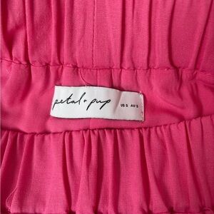 Chic pink skirt set with bold red trim. Sleeveless top and flowing skirt. Perfect for a stylish look.