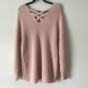 Soft knit with a relaxed oversized fit. V-neck design and cross details across back for casual elegance.