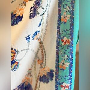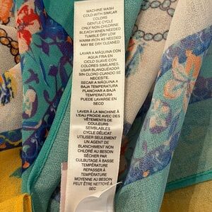 Chico's Multicolor Floral Ruana Wrap. Perfect for use as a swim cover up, lightweight shrug or open-front, kimono-style layering piece. It features a vibrant floral pattern with a color-block design in yellow and teal. 100% nylon.