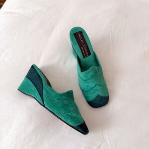 1970s Charles Jourdan Wedge Mules Green Velvet Rare Guy Bourdin Heels