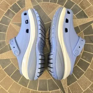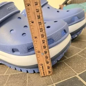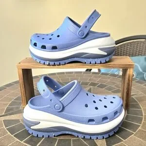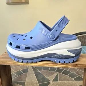 Crocs mega crush platform clogs. The colorway is called Elemental Blue. Chunky treaded sole for extra grip. No flaws noted. Excellent used condition.