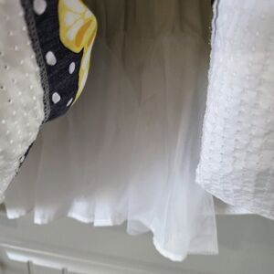 Navy blue dress with yellow butterflies and white polka dots. It is sleeveless and layered underneath. Has keyhole with button back.