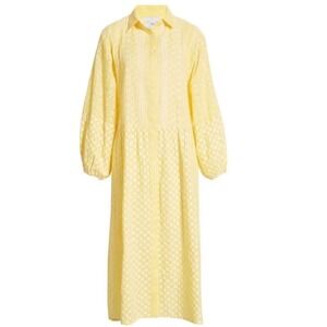 Luna dress showcases intricate eyelet embroidery throughout its breezy silhouette. This midi-length piece features a classic collar and a full button-down front, complemented by voluminous puff sleeves with cuffs. Crafted from a comfortable cotton blend, it offers both style and breathability.