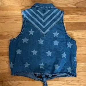 Chic sleeveless denim top with Stars and Stripes pattern. Features button-up front and tie at the waist.
