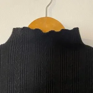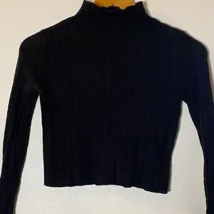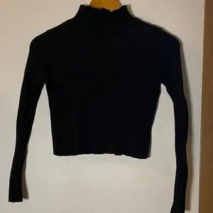 Chic black long sleeve top. Features a ribbed texture and high neckline. Ideal for layering or standalone wear.
