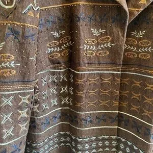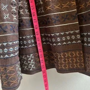 Beautiful women’s open-front jacket featuring embroidered Southwestern / geometric detailing in rich brown and earth tones. This piece has a structured yet lightweight feel, making it perfect for layering through fall, spring, or cool summer evenings. A standout statement jacket that elevates denim, trousers, or dresses with ease.
