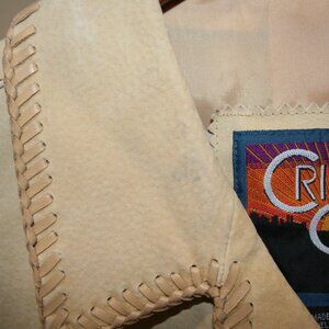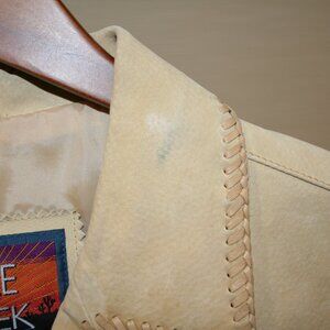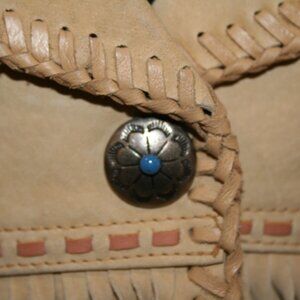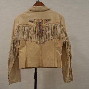 Cripple Creek Suede Fringe Leather Jacket Tan size XL. Turquoise embellishments on the front and back, snaps down the front and sleeves. Approx measurements Length 22.5", Armpit to Armpit 21", Sleeve 24", Bottom width 20" Good pre-owned condition but may need to be cleaned, priced accordingly - multiple blemishes, collar, sleeves and body see pictures.