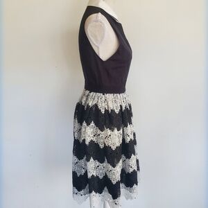 Alice & Olivia button up collared shirt dress with lace skirt and back zipper, grosgrain ribbon waist.