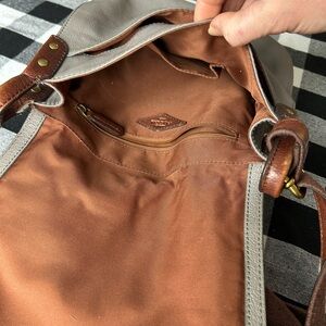 Fossil brand crossbody/shoulder purse. Measures approximately 10”W x 9”L with an adjustable strap drop ranging from 13” to 24” to accommodate your preferred wearing style. Pebbled leather in a pretty stone gray, with brown and brass accents. Shows signs of wear as pictured, priced accordingly. Inner lining, zipper and magnetic snap closures still in great shape.