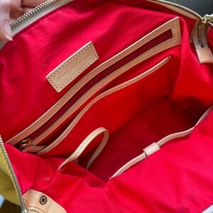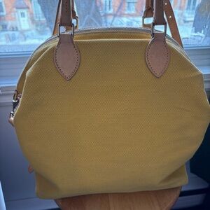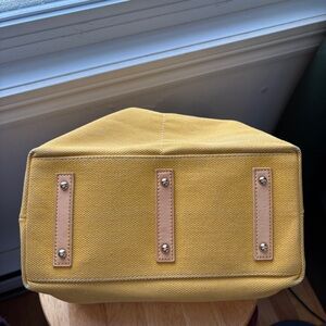 Bright yellow tote with tan leather handles. Features front zipper pockets. Ideal for everyday use.
